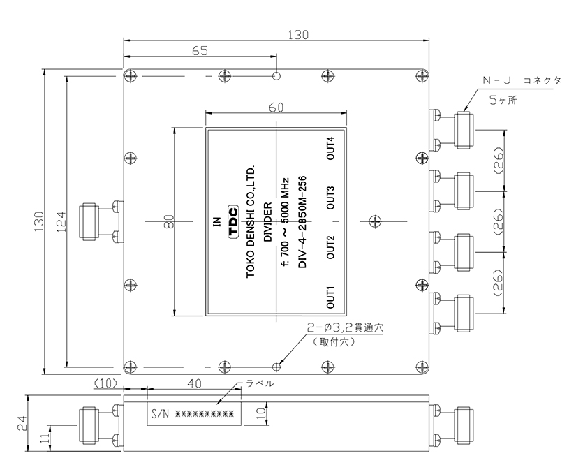 | 入力電力(IN port) | 30W(最大) | 出力ポート(1-4)VSWR 1.5以下 as power Splitter |